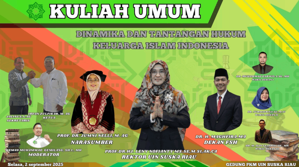 Pekanbaru – Dalam rangka menyambut Tahun Akademik 2025/2026, Fakultas Syariah dan Hukum UIN Sultan Syarif Kasim Riau menyelenggarakan kuliah umum bertajuk “Dinamika dan Tantangan Hukum Keluarga Islam Indonesia”pada Selasa, 2 September 2025. Kegiatan ini digelar secara daring, namun tetap diikuti dengan antusias oleh mahasiswa, dosen, serta civitas akademika yang menjadikan momentum ini sebagai awal semangat perkuliahan semester ganjil.