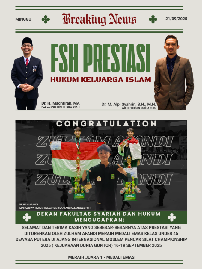 “Prestasi yang diraih oleh Sdr. Zulham Afandi menjadi bukti empirik bahwa mahasiswa Fakultas Syariah dan Hukum UIN Suska Riau tidak hanya memiliki kapasitas akademik, tetapi juga kompetensi non-akademik yang berdaya saing global. Kami menyampaikan apresiasi yang setinggi-tingginya atas dedikasi, disiplin, dan konsistensi yang ditunjukkan. Semoga capaian ini mampu menginspirasi dan memotivasi mahasiswa lain untuk terus mengembangkan potensi diri, sehingga lahir generasi unggul yang tidak hanya membanggakan fakultas, tetapi juga universitas dan bangsa” ujarnya penuh semangat.