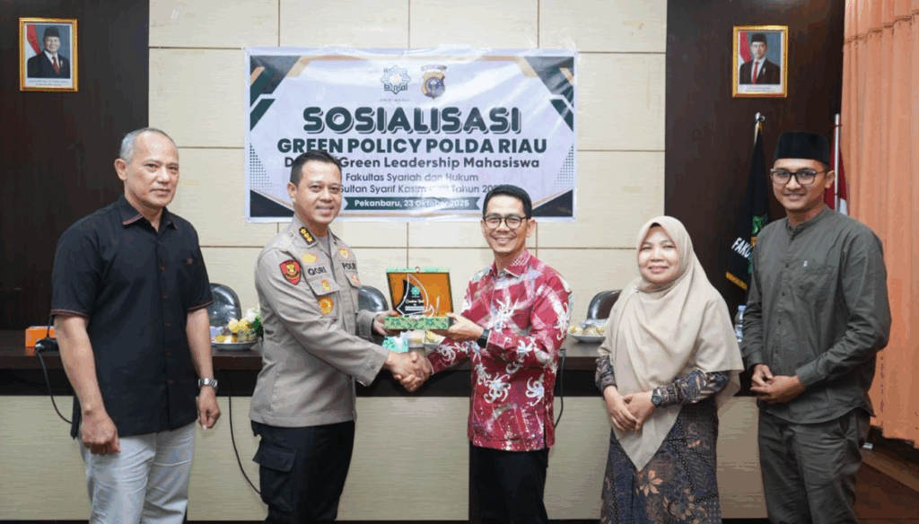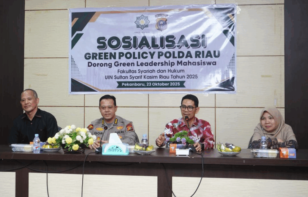 Pekanbaru-Suasana penuh semangat dan antusiasme mewarnai Aula Fakultas Syariah dan Hukum (FSH) Universitas Islam Negeri Sultan Syarif Kasim Riau (UIN Suska Riau) saat Polda Riau melalui Bidang Hukum (Bidkum) menggelar kegiatan Sosialisasi Green Policy, Jumat (24/10). Kegiatan ini menjadi momentum penting dalam menanamkan kesadaran lingkungan dan kepemimpinan hijau di kalangan mahasiswa hukum.